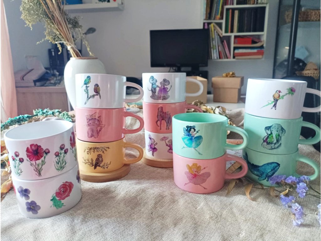 - Tyto malé hrníčky na bambusovém podtácku se také nazývají "makronky" pro jejich roztomilý vzhled, tvar hrnečku i barevnost provedení v pastelových či čistě bílých barvách