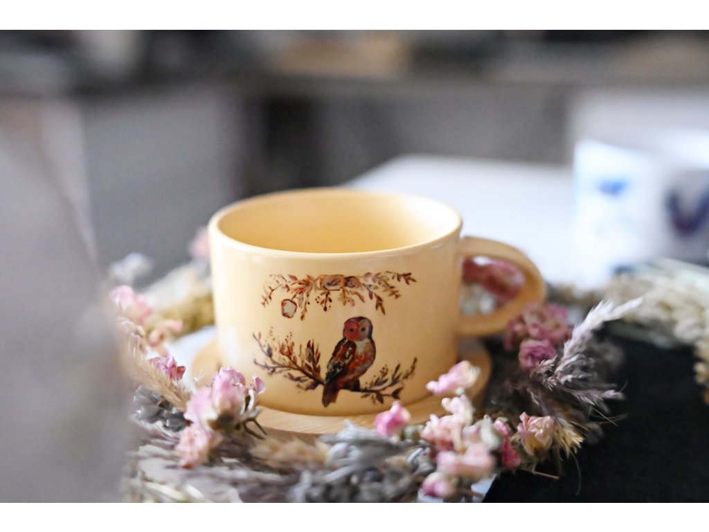 Keramický žlutý hrnek - 200 ml tzv. makronka na bambus podtácku - výběr motivů Výběr motivů