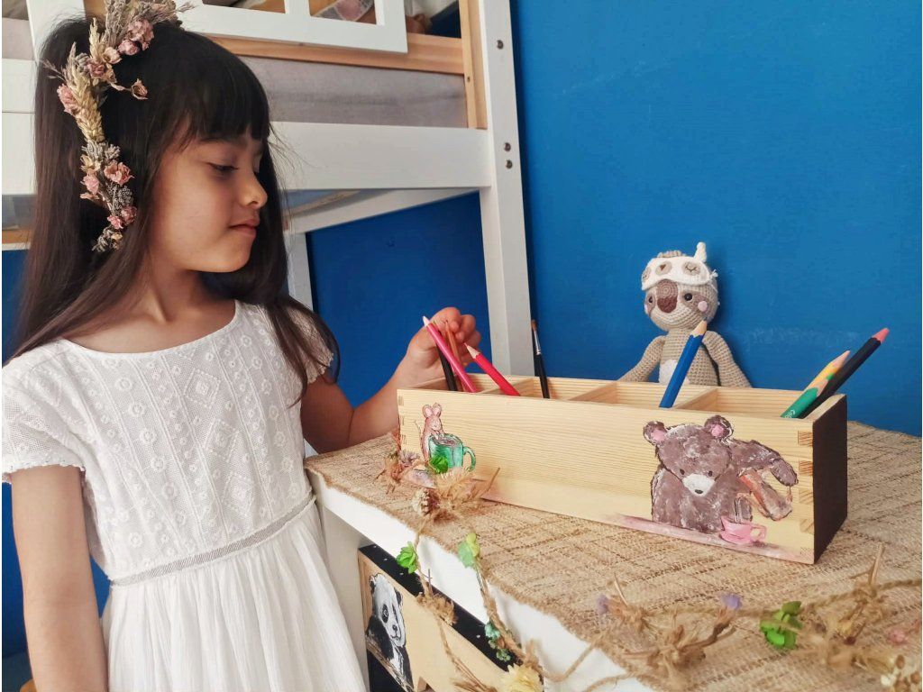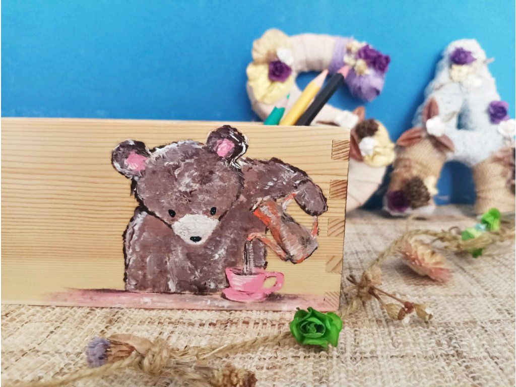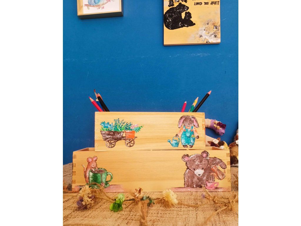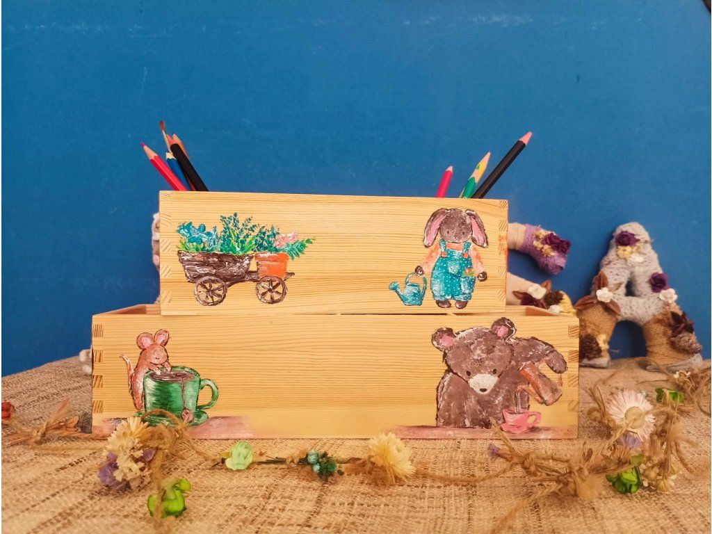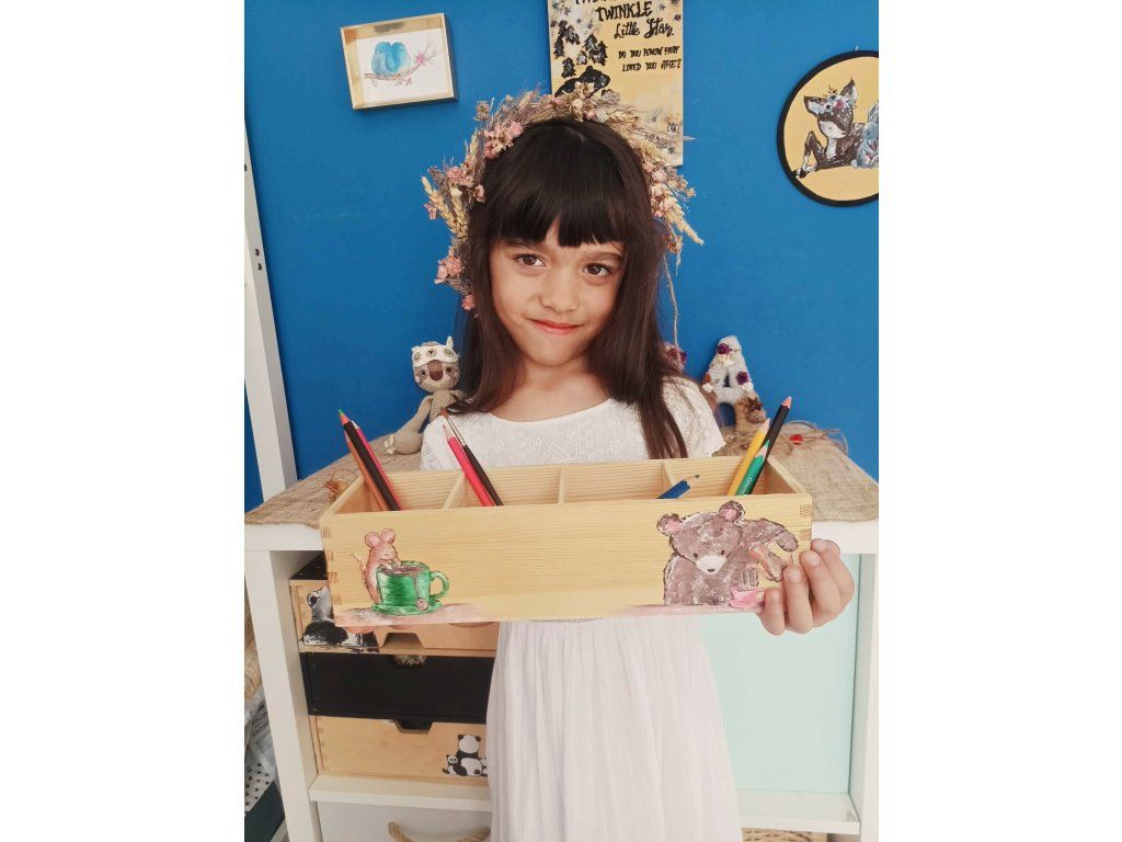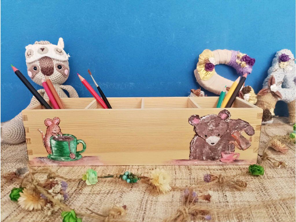 Rozměry pastelkovníku s myškou a medvědem: šířka 31 cm x výška 8 cm x hloubka 8,7 cm