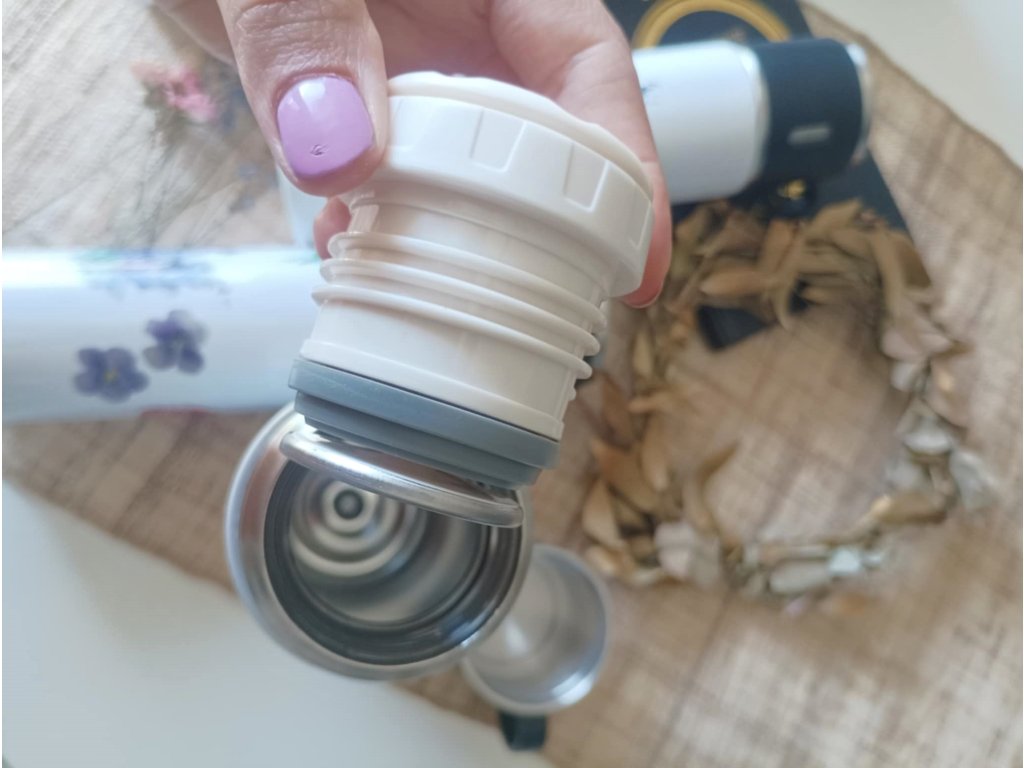 - Šroubovací víčko, součástí je hrnek, takže stačí vyšroubovat, stisknout střed uzávěru a můžete nalít do hrnečku, který se z vnější strany nezahřívá, tak se nemusíte bát, že se popálíte :)